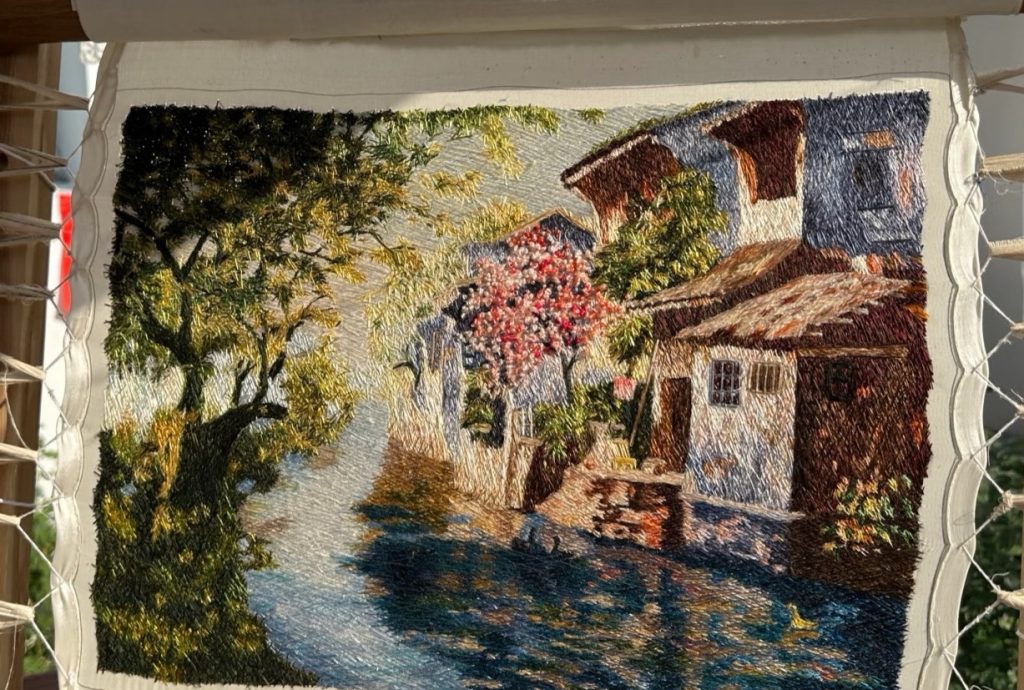 - A unique fusion of traditional embroidery and Western painting techniques.